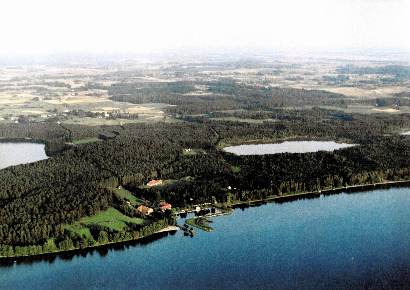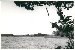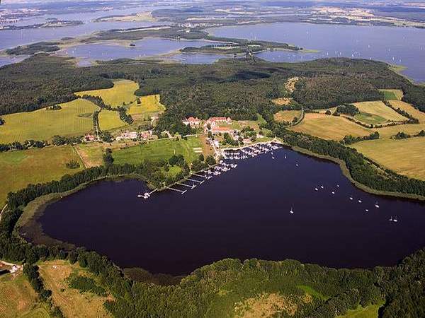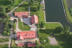 | Blick zum Mauersee mit Grenzen des ehemaligen Grundstücks | Der alte Hof mit Hafen | Vom Hafen aus | Aus der Luft |