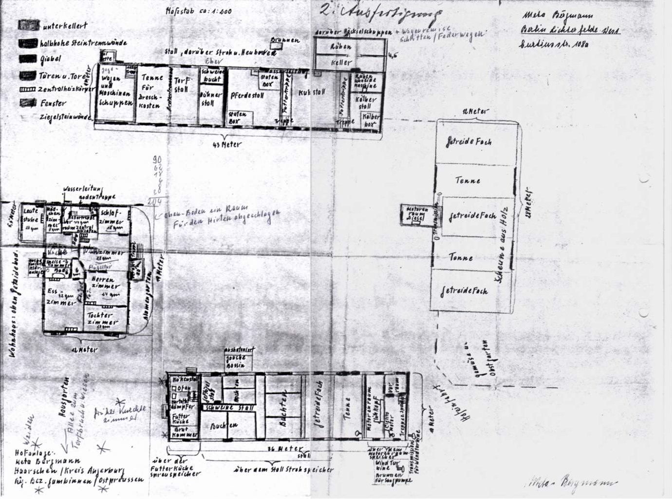 | Der Mauersee zwischen Angerburg und Lötzen und mit Lageangabe des Hofes | Aufnäher der Segelschule aus Stoff | Plan des Hofes mit Hafens und der Segelschule | Gegenüberstellung des alten Grundbesitzes |