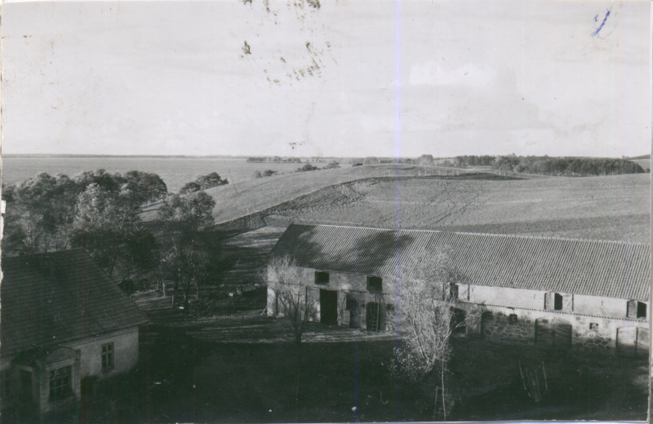 | Blick auf das Wohnhaus | Blick von der Windturbine auf den Hof (In der Mitte das Wohnhaus) 1942 | Blick von der Windturbine Richtung Süden | Die Windturbine mit 2 Kletterern 1940 |