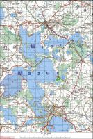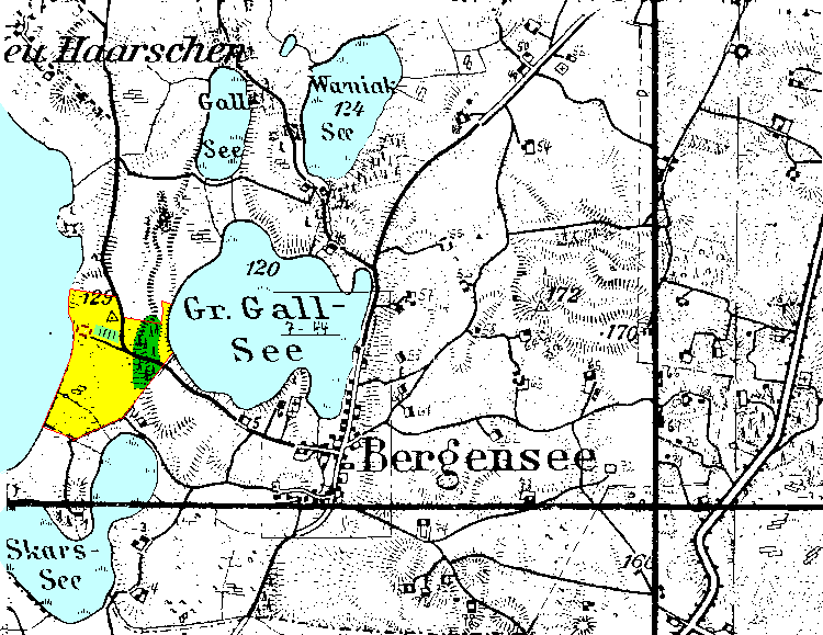 | Aktuellere polnische Karte mit der lage des Hofes | Lage des Hofes - Die Orte mit ihren alten Namen Haarszen - Pietzarken | Lage des Hofes - Die Orte mit ihren neuen Namen Bergensee - Haarschen | |