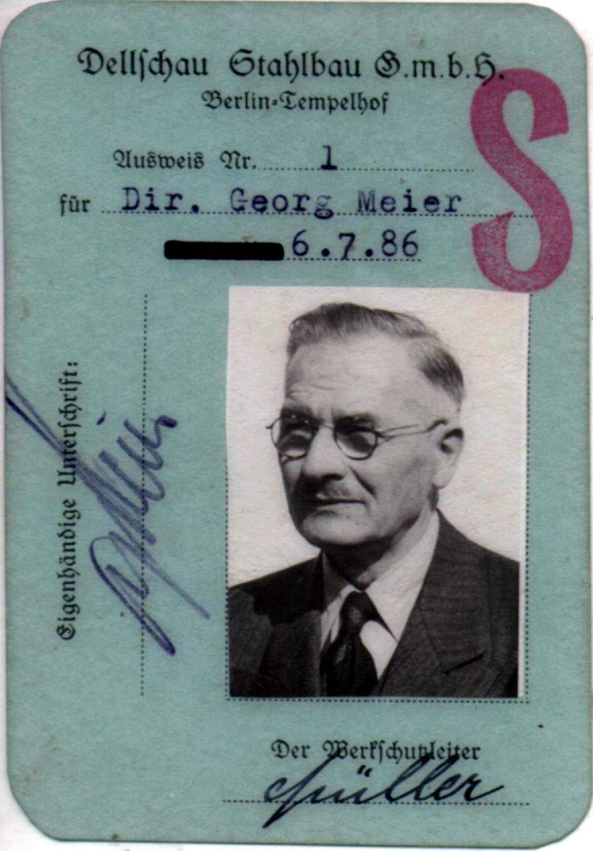 Georg Meier war anfangs Bauleiter in St. Petersburg, anschließend Statiker im Ing.-Büro Gossen. Er war dann über 45 Jahre (Direktor) Technischer Leiter und Geschäftsführer der Firmen Dellschau, Ravené, Degner, Steicke (Alle 4 Firmen Bestandteil der Trägerlagergemeinschaft - TLG) sowie Dellbrück (Diese wurde später aufgelassen). Diese Firmen gehörten zurr Holding der Deutschen Eisenhandel AG. Während des II. Weltkrieges wurden bei Dellschau Sektionen für U-Boote hergestellt. Diese wurden auf dem Wasserweg über den Teltowkanal und die anschließenden Wasserstrassen an die Norddeutschen Werften geliefert. Für diese Transporte erhielt die Schleuse in Machnow eine zusätzliche größere Schleusenkammer. Während des Krieges war er auch für die benachbarte Stahlbaufirma Steffens und Nölle zuständig. Nach dem Krieg wurde ihm von den Amerikanern zusätzlich die Aufsicht über weitere Tempelhofer Stahlbaufirmen wie z.B. Krupp - Druckenmüller übertragen. Nach der Entnazifizierung dieser Firmen gab er diesen Auftrag zurück. Die Firma Dellschau war die Stahlbaufirma und Ravené war für das Handelsgeschäft mit Stahlträgern und Rohren zuständig. Die Firma Dellschau hat in Berlin vor und nach dem Krieg sehr viele Stahlhochbauten und Brücken erstellt. z.B. unter anderem das Hotel Adlon, das Marschallhaus Im Messegelände am Funkturm und sehr viele Strassen- und Bahnbrücken. |