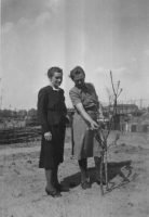 | Inge Bergmann um 1950-51 | Ingeborg Bergmann, Martha Krone (geb. Volkmann) Meta Bergmann (geb. Volkmann) an der Goerzbahn im Hintergrund Neubauten für Flüchtlinge. Wohnblocks für Vertriebene | Martha Krone & Meta Bergmann (Schwestern) im Schrebergarten | Unsere erste Schrebergärten befanden sich neben dem Industriebau West, der zweite am Dahlemer Weg- Oma Bergmann wohnte anfangs bei Meiers in der Lotze Str.,dann in einem Zimmer im Eckhaus Gräfenberger Weg / Ecke Cutiusstr. später in der Vertriebenen-Siedlung an der Brettnacher Str. im Brittendorfer Weg. | ||||||||||