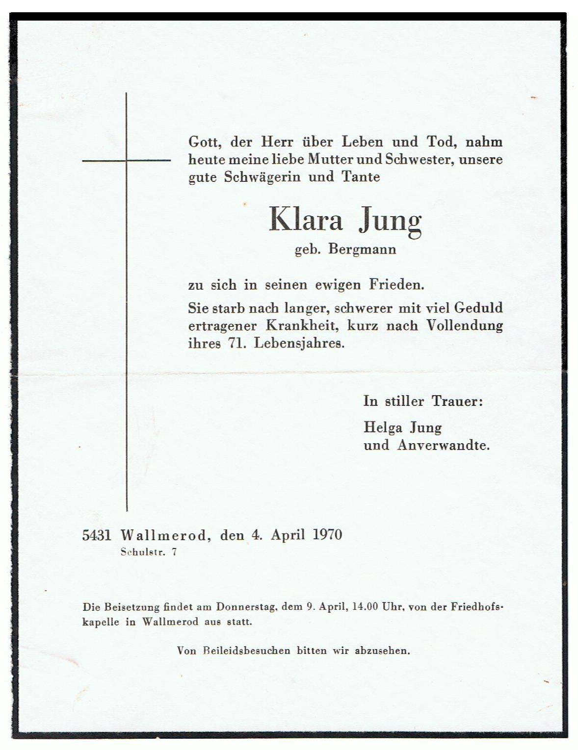 | Stammtafel Peter Jung | Klara Jung geb. Bergmann, Josef Jung und Emmi (Ida) Reimann Frau von Karl Reimann aus Dortmund, Okt. 1949 | v. l. Winfried & Lilli Meier - Klara Jung - Gerhard Meier - Josef Jung - N.N.? - Helga Jung | 1970 Todesanzeige Klara Jung geb. Bergmann | ||||||||||