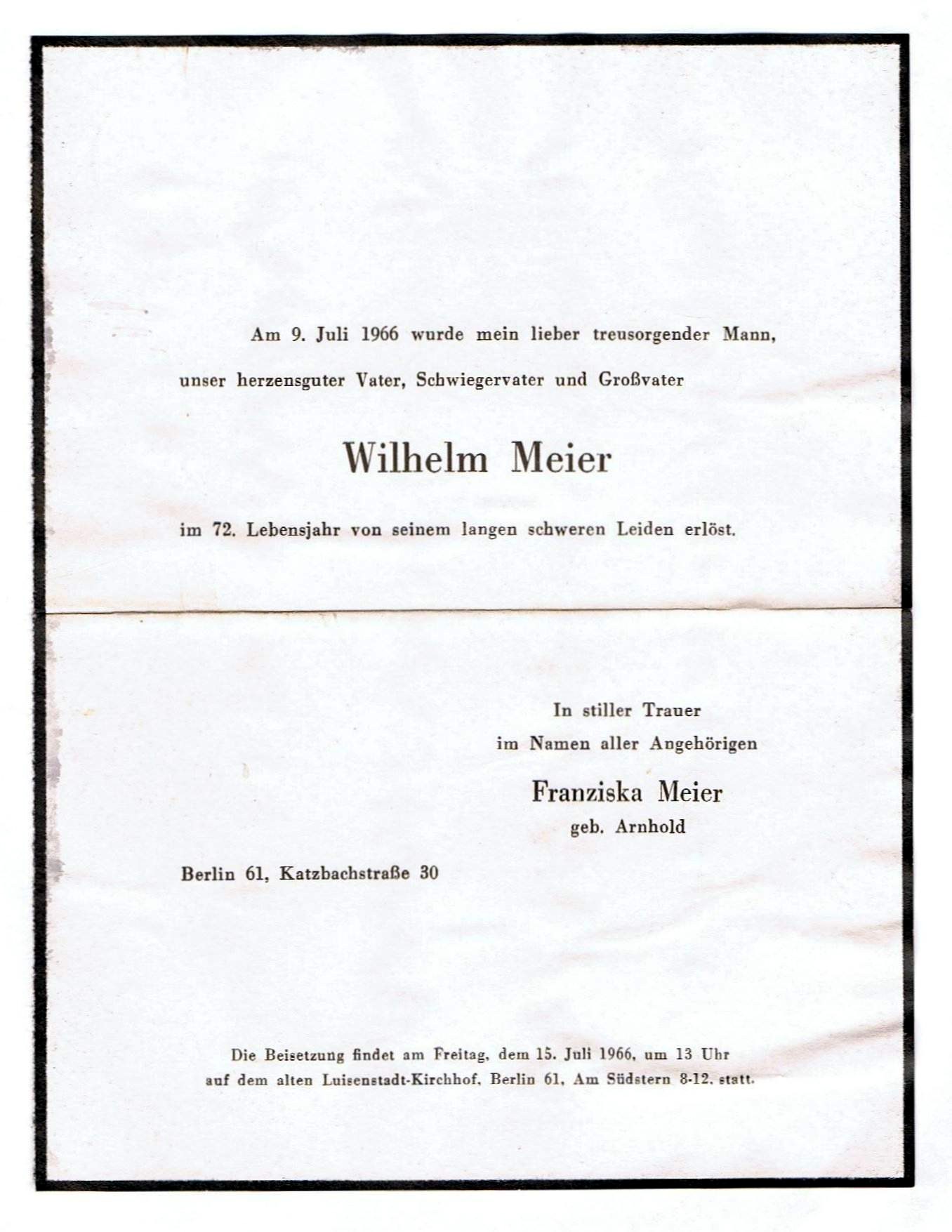 | Wilhelm (Willi) Meier ca.1915 - Bruder von Georg Meier | 1966 Wilhelm Meier - Todesanzeige | 1967 Franziska Meier geb. Arnold - Todesanzeige | |||||||||||
