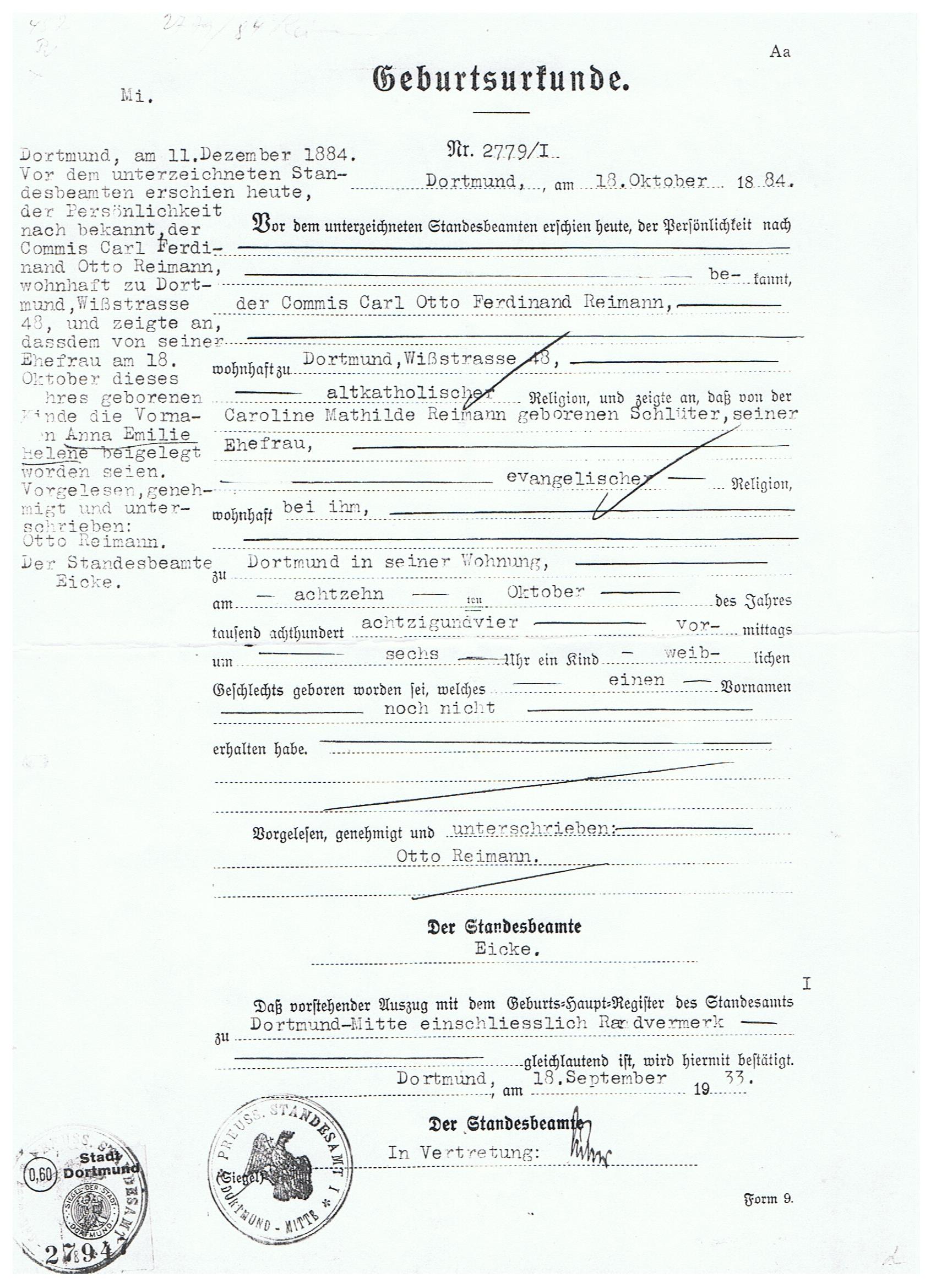 | Schlüter Geburtshaus - Kupferschmiede - Dortmund | 1882 Heiratsurkunde Carl Ferdinand Otto Reimann und Caroline Mathilde Schlüter v | 1882 Heiratsurkunde Carl Ferdinand Otto Reimann und Caroline Mathilde Schlüter h | Caroline Mathilde Bergmann verw. Reimann geb. Schlüter | ||||||||||