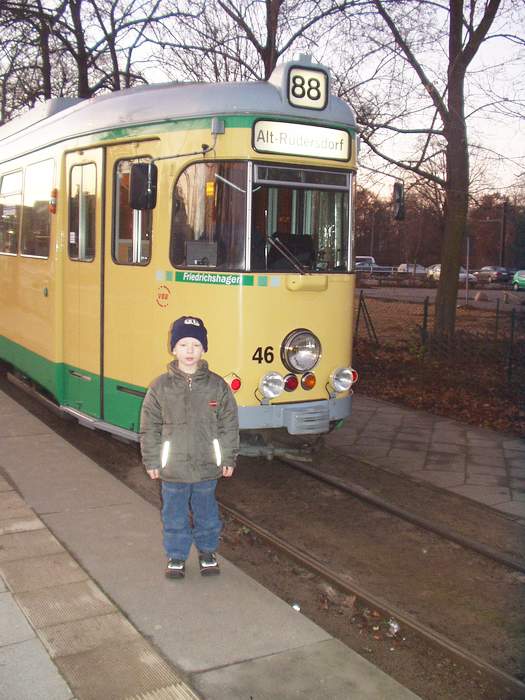 Die Woltersdorfer Straßenbahn - eines der kleinsten Straßenbahnunternehmen in Deutschland - war für uns nicht so interessant und wurde von uns nur wenig besucht. Hierbei machte auch Bernd auch nur wenige Fotos und ich hatte bei meinem Besuch nicht mal einen Fotoapparat dabei. Von mir zu hause war die Bahn umständlich in Berlin zu erreichen. Die von Köpenick aus davor liegende Rüdersdorfer Straßenbahn war für uns interessanter da Schmalspur und hatte eine längere Strecke. Auszüg aus Wikipedia: Die Woltersdorfer Straßenbahn GmbH ist ein Nahverkehrsunternehmen, welches eine regelspurige Überlandstraßenbahn in der Gemeinde Woltersdorf (Landkreis Oder-Spree) am östlichen Stadtrand Berlins betreibt. Die Strecke wurde am 17. Mai 1913 auf einer Länge von 5,6 Kilometern eröffnet. Bis heute ist die Streckenführung unverändert geblieben. Der Betrieb zählt zu den kleinsten Straßenbahnbetrieben der Welt. Die Bahn bedient auf ihrer Strecke zehn Haltestellen und benötigt dafür rund 16 Minuten. Im Frühjahr 1990 verstärkte sich das Fahrgastaufkommen wieder, die Strecke wurde grundsaniert und danach verkehrte die Woltersdorfer Straßenbahn unter der Liniennummer 87. Die Strecke verläuft vom S-Bahnhof Rahnsdorf zunächst für rund zwei Kilometer geradlinig durch den Berliner Stadtforst. An der Landesgrenze nach Brandenburg wird die Bebauung der Gemeinde erreicht. Die Straßenbahn fährt dort zunächst durch ein älteres, suburbanes Wohngebiet (Berliner Straße) und ein im Aufbau begriffenes Neubaugebiet (Berliner Platz), bis sie am Thälmannplatz das Ortszentrum erreicht. Von dort führt die Strecke die abschüssige Schleusenstraße hinunter bis zur Endstation an der zwischen Flakensee und Kalksee gelegenen Woltersdorfer Schleuse. Jenseits der Schleuse liegt wiederum ein Waldgebiet (die Rüdersdorfer Heide). Aufgrund des schönen Streckenverlaufs mit Wäldern und Seen spielt für die Woltersdorfer Straßenbahn der Ausflugsverkehr eine wichtige Rolle, hauptsächlich dient sie jedoch als Zubringer der rund 8.000 Einwohner von Woltersdorf zur S-Bahn Richtung Berlin (Linie S 3). Die gesamte Strecke ist eingleisig; Ausweichstellen befinden sich am Thälmannplatz sowie in der Nähe der Stadtgrenze und seit dem Sommerfahrplan 2006 auch am Berliner Platz. Weiteres unter: http://de.wikipedia.org/wiki/Woltersdorfer_Straßenbahn |